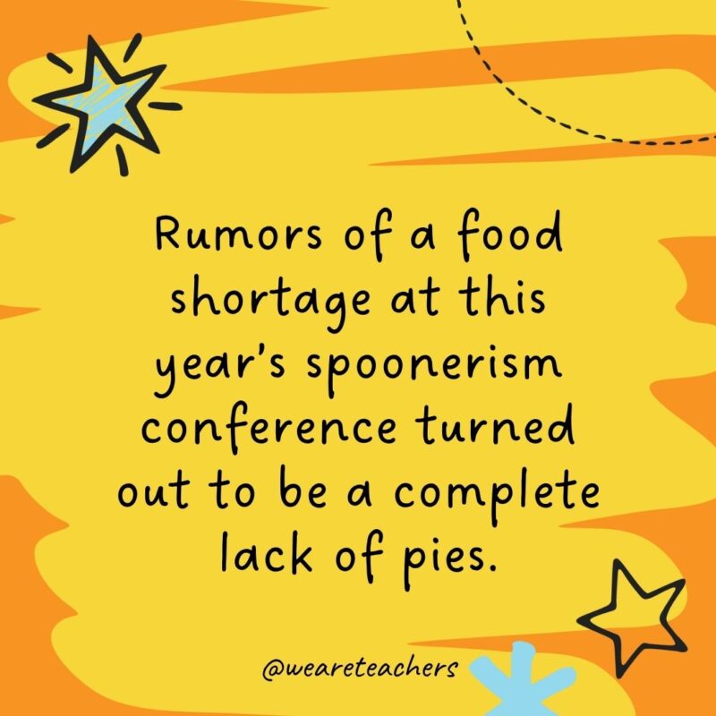 28. Rumors of a meals scarcity at this yr’s spoonerism convention turned out to be an entire lack of pies.