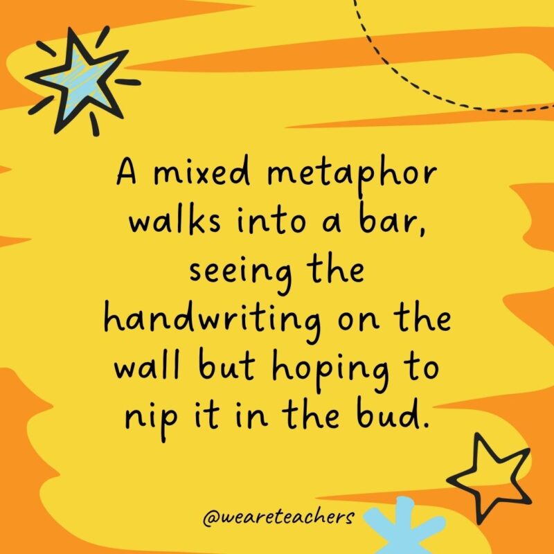 44. A blended metaphor walks right into a bar, seeing the handwriting on the wall however hoping to nip it within the bud.