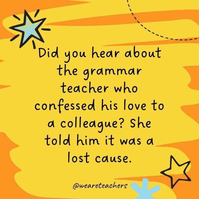 45. Did you hear in regards to the grammar trainer who confessed his like to a colleague? She informed him it was a misplaced trigger.