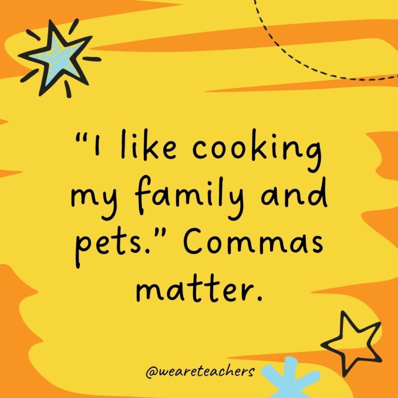 56. “I like cooking my household and pets.” Commas matter.