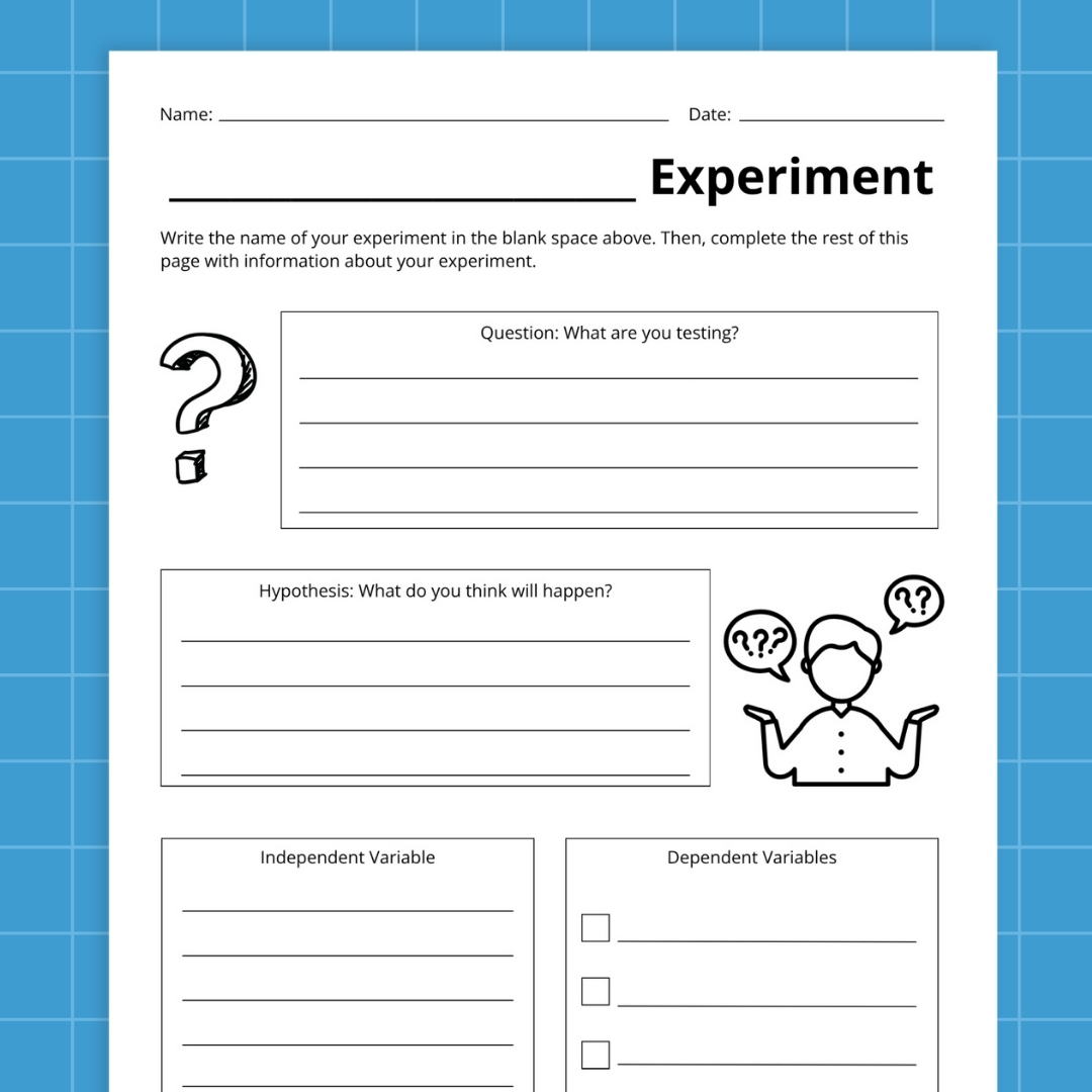 On the primary web page, college students report the identify of their experiment and pose the query they’re making an attempt to reply. There’s room to report their speculation in addition to the dependent and unbiased variables.