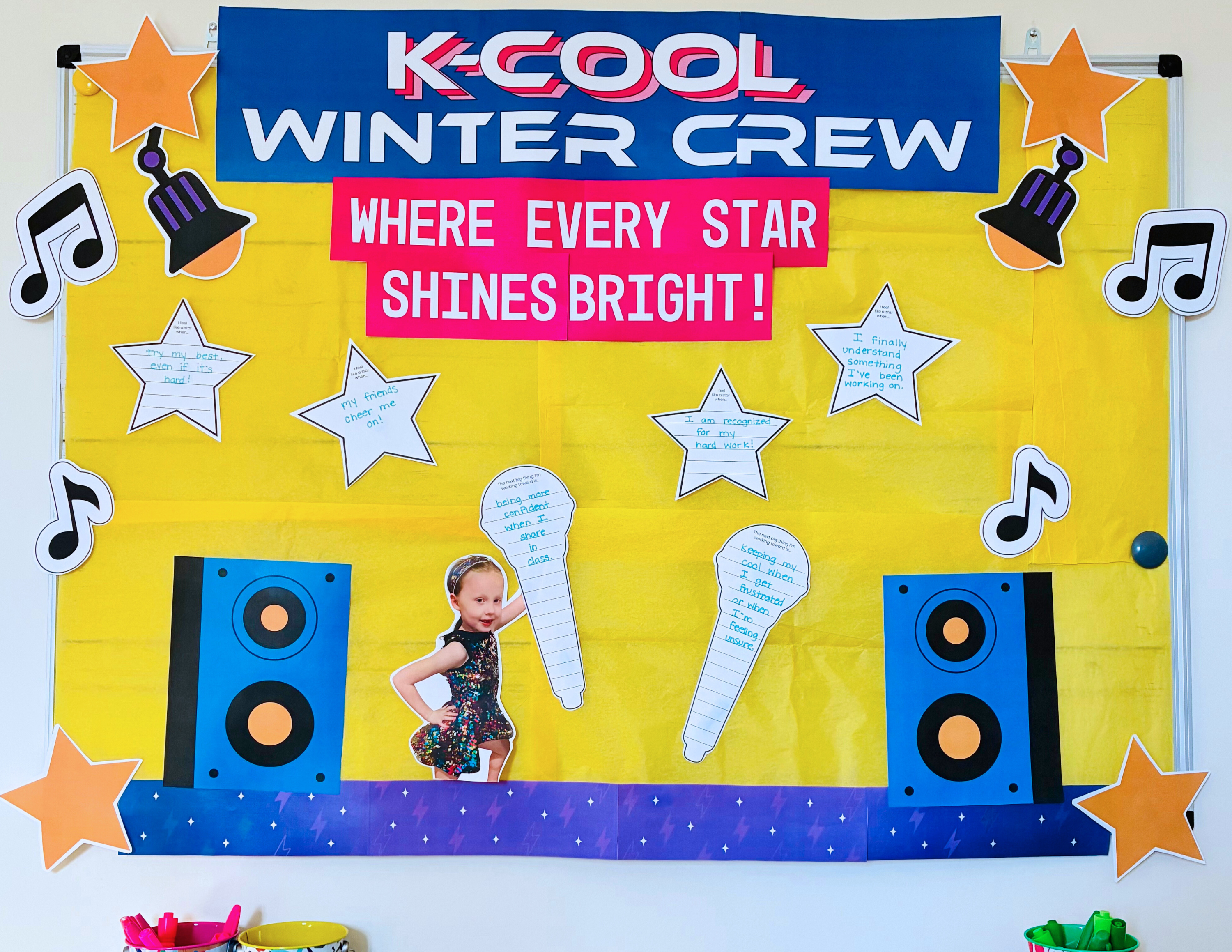 Create your personal stage scene with the pink, purple, and blue gradient border, stars, music notes, and stereo cutouts. Cling the title banner “Okay-Cool Winter Crew” with the subtitle “The place Each Star Shines Shiny!”